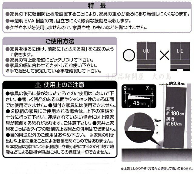 ※ 本製品は揺れによる転倒防止を最小限にすることが目的で地震による破損や事故に対しての保障は一切できません。
